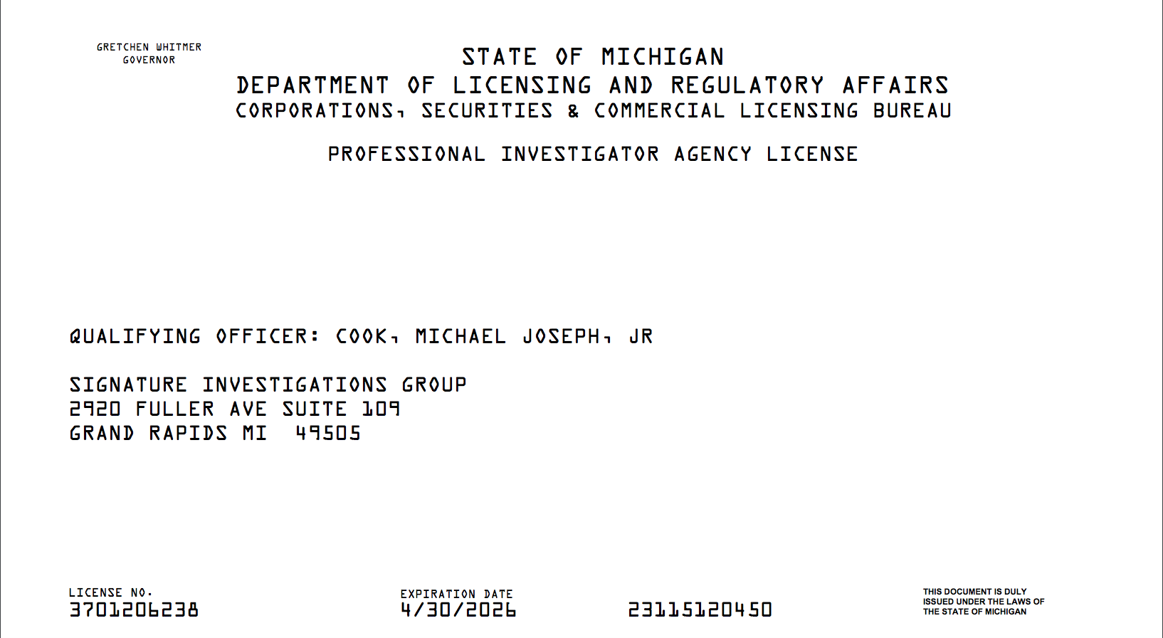 The cases we work are primarily in Western Michigan, but we have covered cases as far away as Houghton/Hancock, Marquette, Saginaw and the Detroit area. Our investigations are broad and include: surveillance, background checks, locates, skip tracing, cheating spouse, child abuse, elder care abuse, elder financial abuse, child custody, pre-marital, child endangerment, disability, child neglect, civil fraud, dead beat parent, divorce, document retrieval, elder abuse, elder neglect, embezzlement, employee drug use and sales, employee theft, espionage, workplace theft, hidden cameras, mystery shopping, nanny cam, process service, refuse retrieval (trash run), spousal abuse, stalking, undercover, undue influence, teen investigations and surveillance, theft, vandalism, workman's compensation fraud and many other investigations.